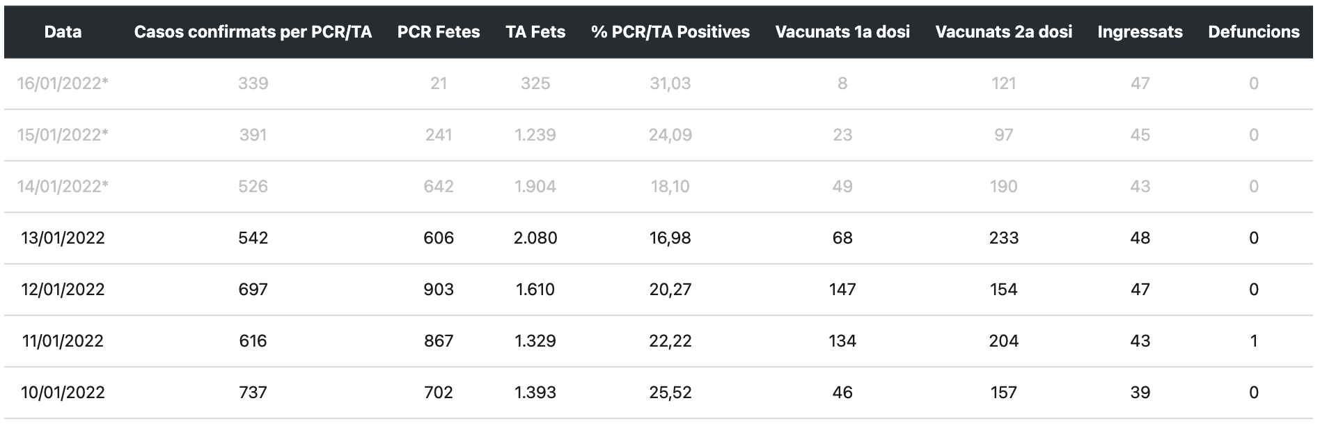 Si mirem el portal dadescovid.cat que mostra les xifres diàries exactes, el rècord és del dia 10 de gener amb 737 casos de Covid-19 i sembla que ja s’ha superat el pic de contagis. A continuació podeu veure les dades diàries: