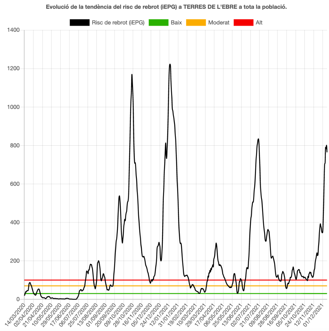 La pandèmia de la Covid-19 va a l’alça, ja que la velocitat de contagi (Rt) supera l’1, però baixa disset centèsimes respecte ahir fins a 1,42. El risc de rebrot també baixa i ho fa 10 punts fins a 764, risc molt alt. Tenen un risc molt alt les quatre comarques, la Ribera d’Ebre de 365, el Montsià de 717, la Terra Alta de 1.222 i el Baix Ebre de 994.