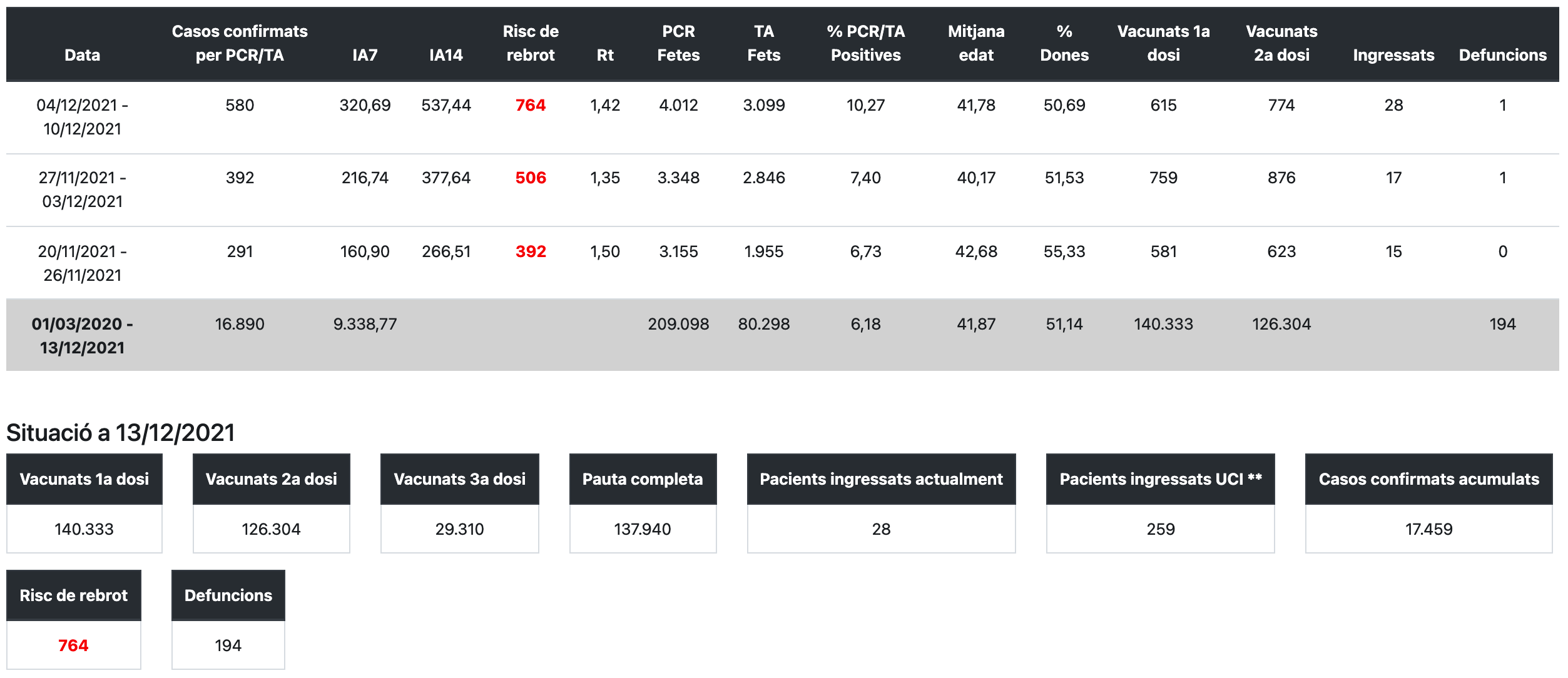 Segons dadescovid.cat, actualment hi ha 34 persones ingressades per Covid-19, 6 de les quals a l’UCI, una menys. A les Terres de l’Ebre han mort 194 persones des de l’inici de la pandèmia, una més. Les dues últimes defuncions daten del 5 i de l’11 de desembre. La incidència a 7 dies és de 321 i a 14 dies és de 537. El 10,27% de les proves que es fan donen positiu.