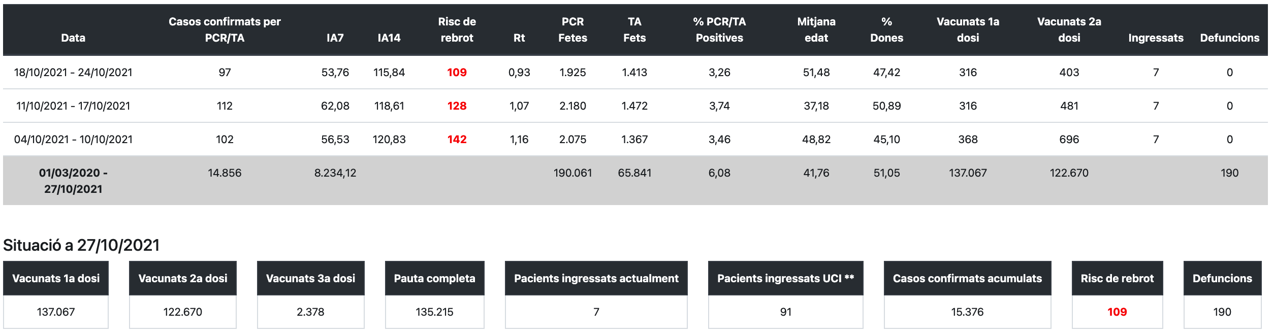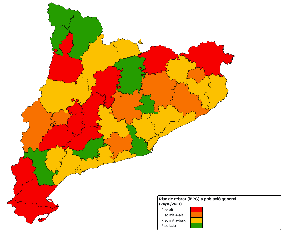 La pandèmia de la Covid-19 va a la baixa, ja que la velocitat de contagi (Rt) se situa per sota de l’1, però puja dues centèsimes fins a 0,93. El risc de rebrot puja sis punts i és de 109, risc alt. Té un risc molt baix la Ribera d’Ebre (8), alt el Baix Ebre (114) i el Montsià (111) i molt alt la Terra Alta (510).