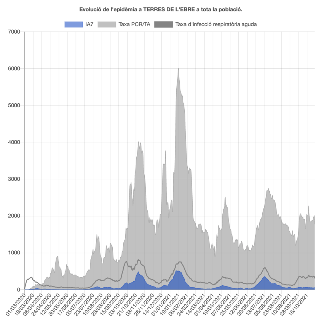 Segons dadescovid.cat, hi ha 12 persones ingressades per Covid-19, igual ahir, 3 de les quals a l’UCI. A les Terres de l’Ebre han mort 191 persones des de l’inici de la pandèmia, cap més. Les dues últimes defuncions daten 30 de setembre i del 29 d’octubre. La incidència a 7 dies és de 49 i a 14 dies és de 104. El 3,41% de les proves que es fan donen positiu.