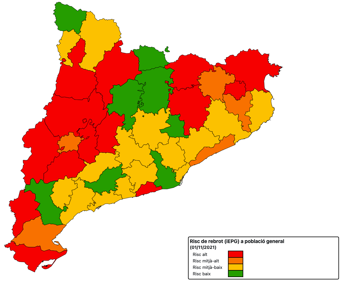 La pandèmia de la Covid-19 augmenta, ja que la velocitat de contagi (Rt) se situa a 1 i puja una centèsima respecte ahir. El risc de rebrot baixa cinc punts fins a 106, risc alt. Té un risc baix la Ribera d’Ebre (22), mitjà-alt el Baix Ebre (96), alt el Montsià (140) i molt alt la Terra Alta (298).