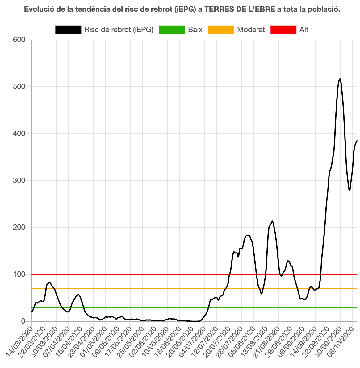 Tortosa registra un risc de rebrot de de 936,72, 18,5 punts més que en l’últim balanç. La setmana anterior era de 897,31. La velocitat de propagació també puja, en concret passa d’1,03 a 1,10, i se situa per damunt de l’interval de la setmana anterior que era d’1,05. La taxa de confirmats per PCR està en 465,10 per cada 100.000 habitants. En total s’han detectat des de l’inici de la padèmia 702 positius, 646 dels quals a través de prova PCR.