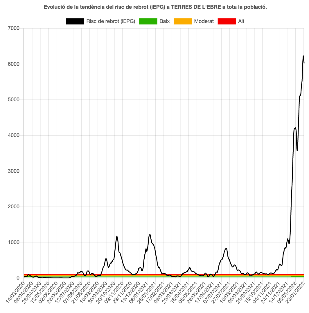 La pandèmia segueix en augment, ja que la velocitat de contagi (Rt) supera l’1, però baixa dues centèsimes fins a l’1,14. El risc de rebrot també baixa i ho fa 86 punts fins a 6.019 (risc molt alt). Tenen un risc molt alt les quatre comarques: la Ribera d’Ebre de 5.897, el Montsià de 5.651, la Terra Alta de 5.279 i el Baix Ebre de 6.634.