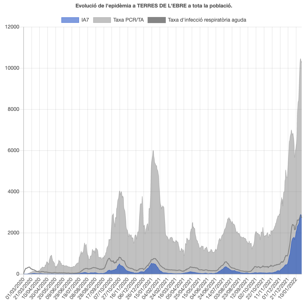 Entre el 18 i el 24 gener, que és l’última setmana de la qual es tenen dades fiables, es van registrar 5.084 casos, més que la setmana anterior, quan se’n van detectar 4.488. Per comarques, el Baix Ebre ha registrat l’última setmana 2.366 positius, el Montsià 1.893, la Terra Alta 310 i la Ribera d’Ebre 510.