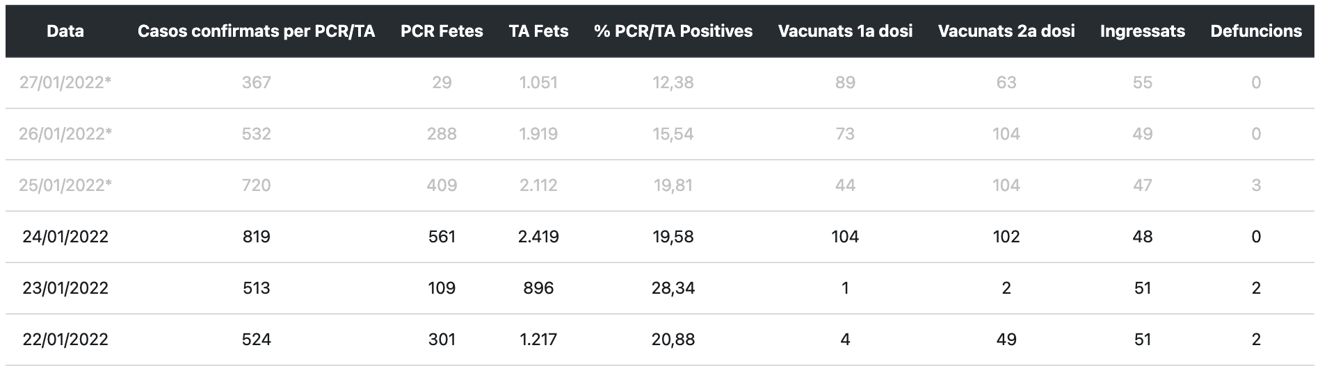 Segons dadescovid.cat, actualment hi ha 68 persones ingressades per Covid-19, vuit més que ahir, 13 de les quals a l’UCI. A les Terres de l’Ebre han mort 229 persones des de l’inici de la pandèmia, tres més. Les últimes defuncions daten 25 de gener. La incidència a 7 dies és de 2.813 i a 14 dies és de 5.297. El 17,41% de les proves que es fan donen positiu.