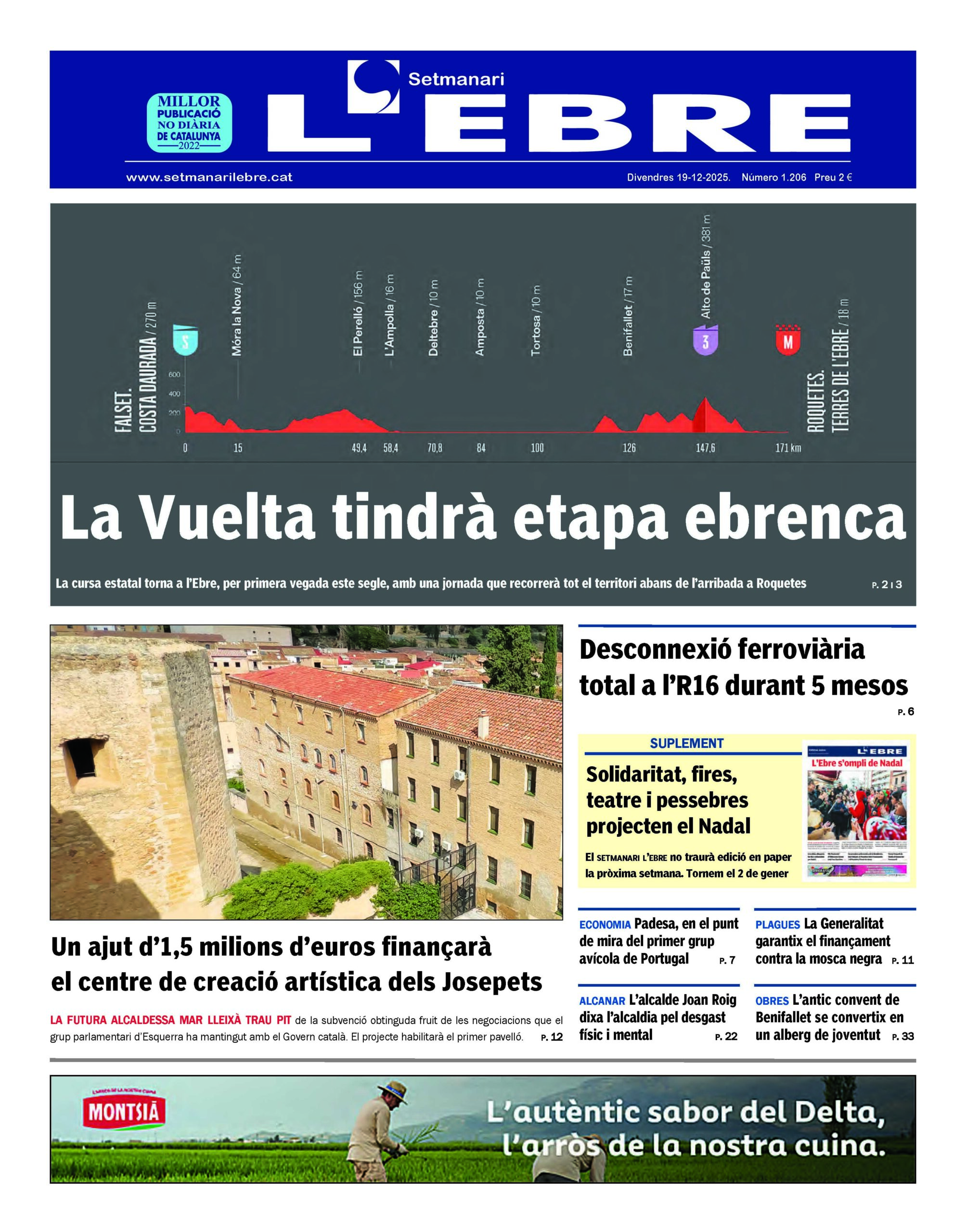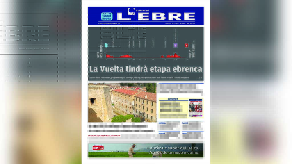 La portada de l’edició en paper número 1206 del Setmanari l’Ebre dedica el titular i la imatge principals de portada a la quinta etapa de la pròxima edició de la Vuelta a Espanya, que sortirà de Falset i recorrerà les Terres de l’Ebre abans del final previst a Roquetes, després d’haver superat els colls de Som i Paüls en el tram final. L’aposta de la Diputació de Tarragona fa que per primera vegada en este segle la cursa estatal torne al territori.