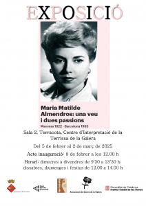 Del 5 de febrer al 2 de març, el Centre d’Interpretació de la Terrissa de la Galera acollirà l’exposició “Maria Matilde Almendros: una veu dues passions”, organitzada per l’Institut Català de les Dones. La inauguració serà el dissabte 8 de febrer, a les 12 del migdia.