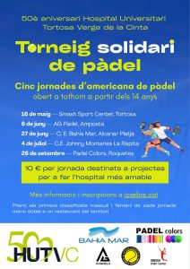 En el marc del seu 50è aniversari, l’Hospital Universitari de Tortosa Verge de la Cinta (HUTVC) ha organitzat un torneig solidari de pàdel amb l’objectiu de promoure hàbits saludables i recaptar fons per a projectes d’humanització i millora assistencial. La iniciativa està oberta a tota la ciutadania i també als professionals sanitaris.