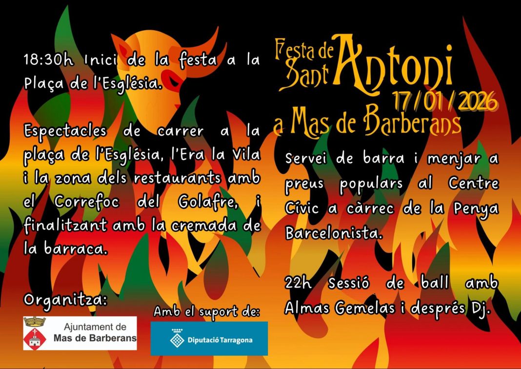 Mas de Barberans viurà el dissabte 17 de gener una nova edició de la Festa de Sant Antoni, una de les celebracions tradicionals més arrelades al municipi, i que s’iniciarà a les 18.30 h a la Plaça de l’Església.