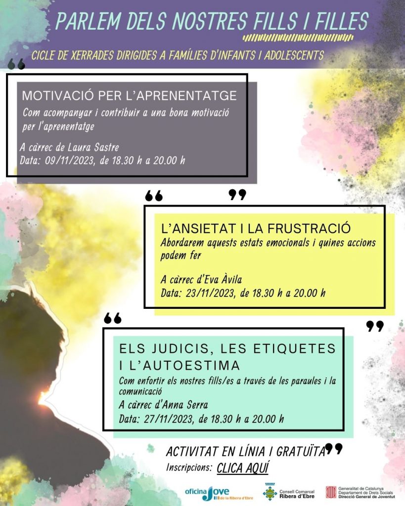 L’àrea de Joventut del Consell Comarcal de la Ribera d’Ebre, amb el suport de la Direcció General de Joventut, organitza aquest mes de novembre el cicle Parlem dels Nostres fills/es, unes xerrades dirigides a famílies d’infants, adolescents i joves, així com educadors o qualsevol persona interessada en l’acompanyament i tasca educativa. Es tracta d’una activitat en línia, que serà presentada per la consellera comarcal de Joventut, Maria Rosa Garcia, aquest dijous 9 de novembre, coincidint amb la primera de les xerrades, de temàtica variada.
