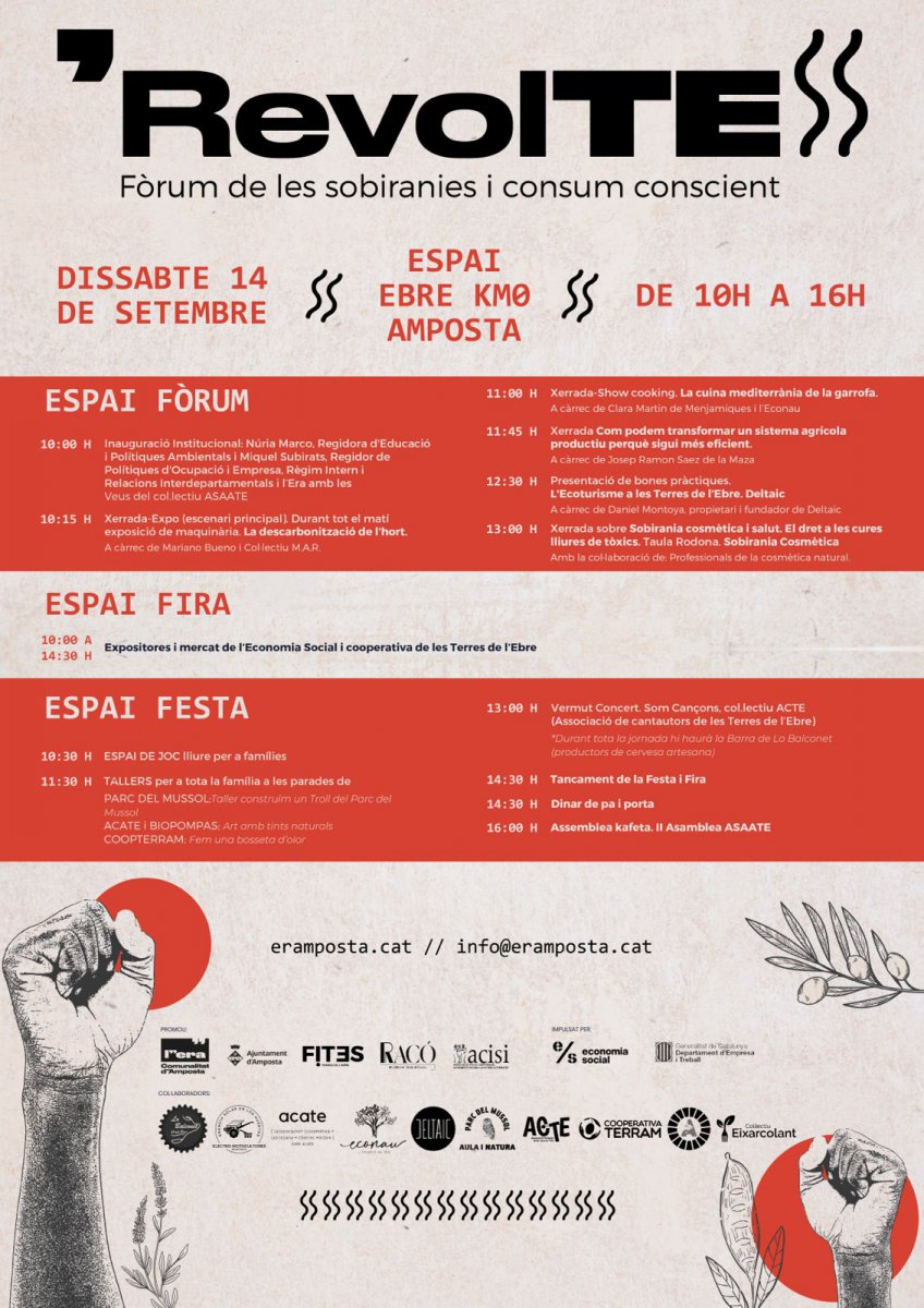 Aquesta tardor neix la primera edició de RevolTESS, el Fòrum de les sobiranies i del consum conscient d’Amposta per a oferir un espai on donar a conèixer iniciatives que ofereixen productes i serveis de proximitat, sostenibles i respectuosos amb el medi ambient. Des de l’ERA, la Comunalitat Urbana d’Amposta, de la qual l’Ajuntament en forma part, i amb la col·laboració de diversos col·lectius, RevolTESS pretén esdevenir un punt de trobada per a projectes i entitats que, mitjançant la seva activitat, contribueixen a transformar el model econòmic per contribuir a la sostenibilitat, l’ecologia i la sobirania alimentària, facilitant que les persones puguin prendre decisions conscients sobre les seves formes de consum. RevolteSS tindrà lloc el pròxim 14 de setembre al pati de l’Oficina de Turisme d’Amposta, durant tot el matí.