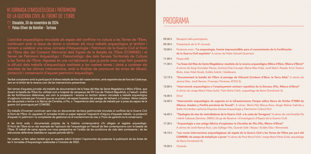 - 09:30 h Presentació de la VI Jornada d’Arqueologia i Patrimoni de la Guerra Civil al front de l’Ebre.