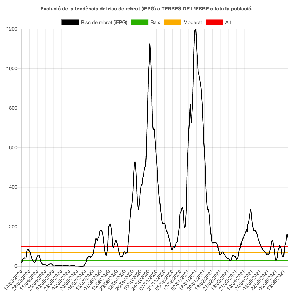 La velocitat de propagació de la Covid-19 (Rt) baixa fins a l’1,83 a les Terres de l’Ebre, 24 centèsimes menys que ahir, però com aquest índex és superior a l’1 significa que la pandèmia creix. El risc de rebrot baixa i ho fa 11 punts fins a 144 (alt). Per comarques, el risc és mitjà-baix al Montsià amb 60 punts, molt alt al Baix Ebre amb 298 i baix a la Ribera d’Ebre amb 27 punts i a la Terra Alta amb 8.
