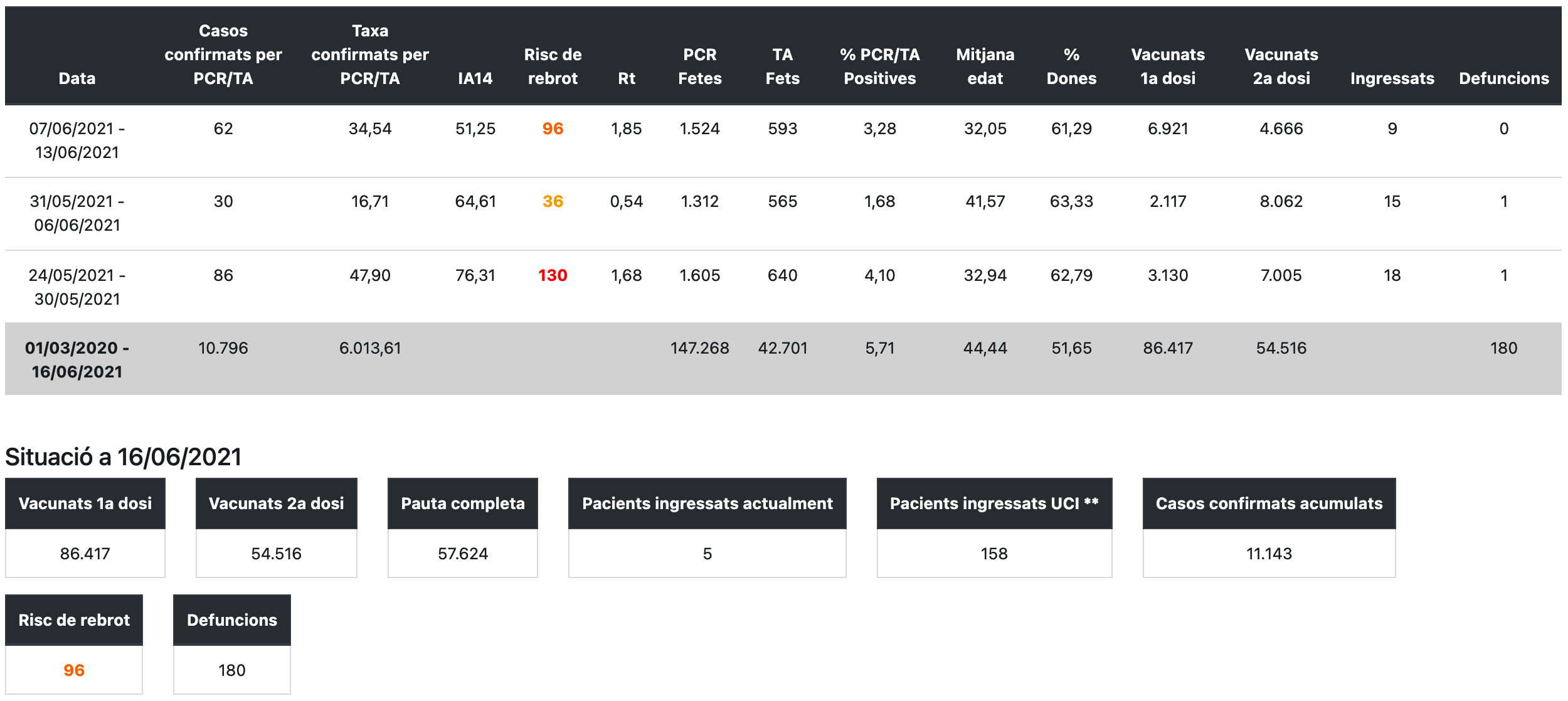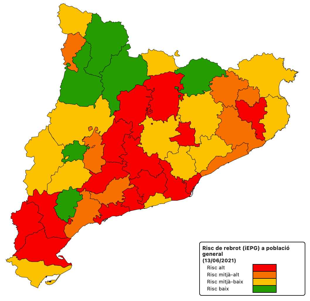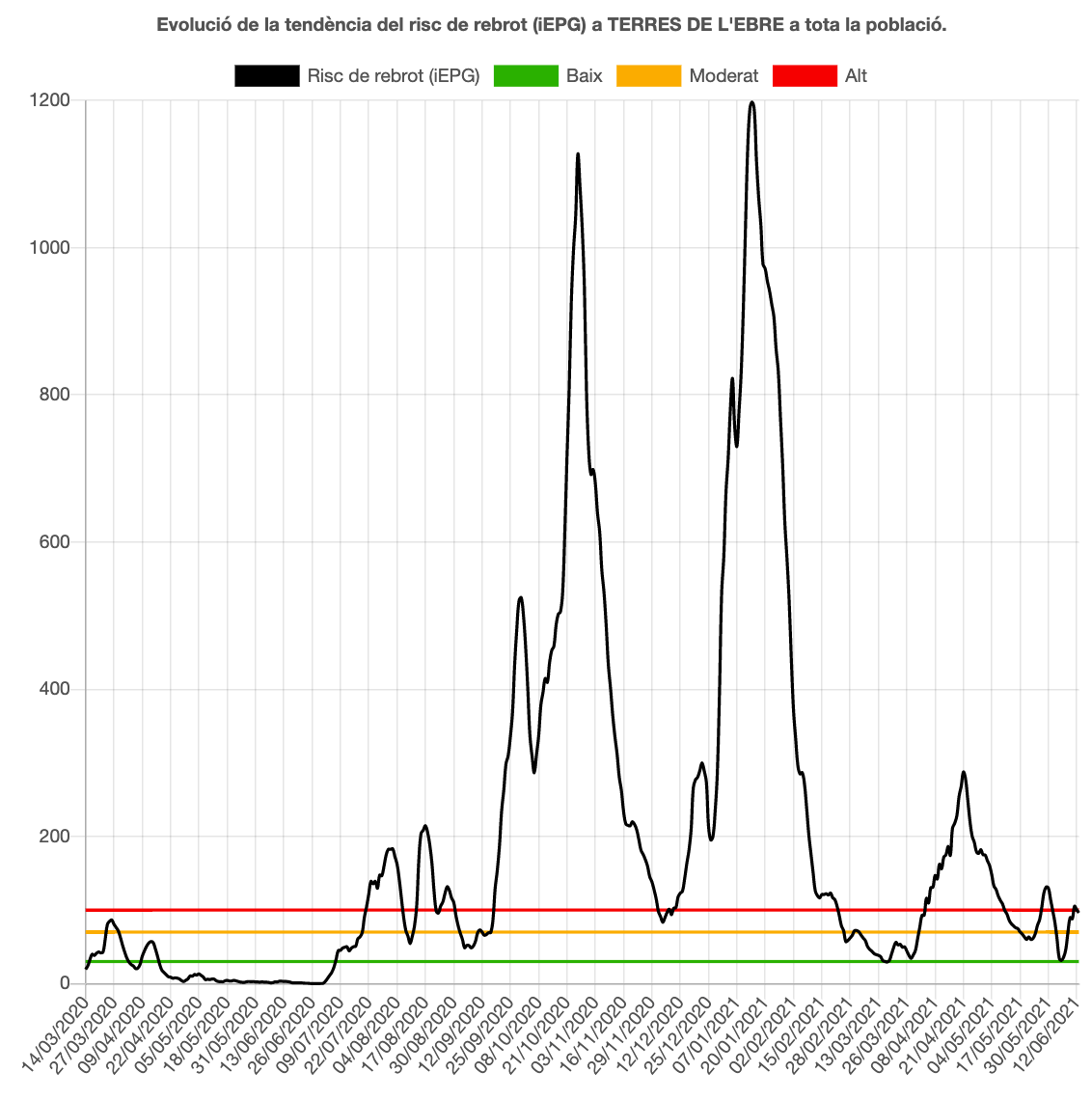 El risc de rebrot baixa dels 100 punts i se situa a 96 (mitjà-alt). Per comarques, el risc de rebrot és mitjà-baix al Montsià amb 54 punts, molt alt a la Ribera d’Ebre amb 250 i alt a la Terra Alta amb 126 i al Baix Ebre amb 106 punts. L’Rt és superior a l’1 a totes les comarques: al Montsià d’1,9, d’1,59 al Baix Ebre, de 2,28 a la Terra Alta i de 3,5 a la Ribera d’Ebre.