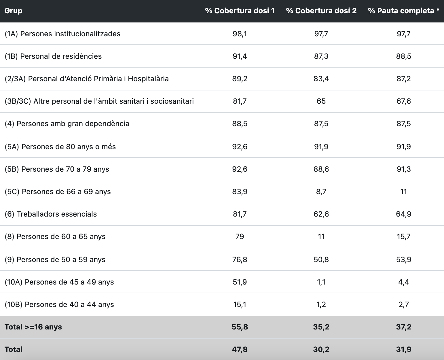 A les Terres de l’Ebre no s’ha detectat cap nova mort i el total és de 180. Els vacunats de la primera dosi arriben a les Terres de l’Ebre a 86.417 (47,8%) i a 54.516 (30,2%) els vacunats de la segona i hi ha 57.634 (31,9%) persones amb la pauta completa, segons dadescovid.cat. Els vacunats de la primera dosi majors de 16 anys son el 55,8% i amb la pauta completa el 37,2%. El 76,8% de la població ebrenca de 50 a 59 anys ja s’ha vacunat amb una dosi, també ho han fet un 51,9% de les persones d’entre 45 o 49 anys i un 15,1% de les de 40 a 44 anys.
