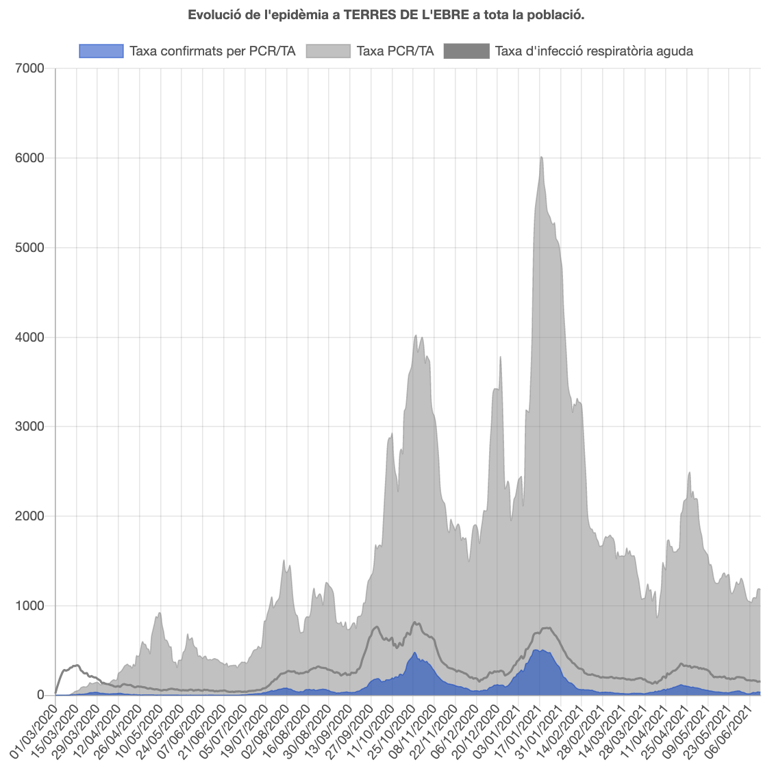 El risc de rebrot baixa dels 100 punts i se situa a 96 (mitjà-alt). Per comarques, el risc de rebrot és mitjà-baix al Montsià amb 54 punts, molt alt a la Ribera d’Ebre amb 250 i alt a la Terra Alta amb 126 i al Baix Ebre amb 106 punts. L’Rt és superior a l’1 a totes les comarques: al Montsià d’1,9, d’1,59 al Baix Ebre, de 2,28 a la Terra Alta i de 3,5 a la Ribera d’Ebre.