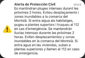 Demanen precaució: evitar els desplaçaments i són necessaris, evitar travessar rius, rieres i barrancs. L’avís de Protecció Civil informa que si entra aigua als habitatges, “pugeu a plantes superiors i truqueu al 112 en cas d’emergència“.