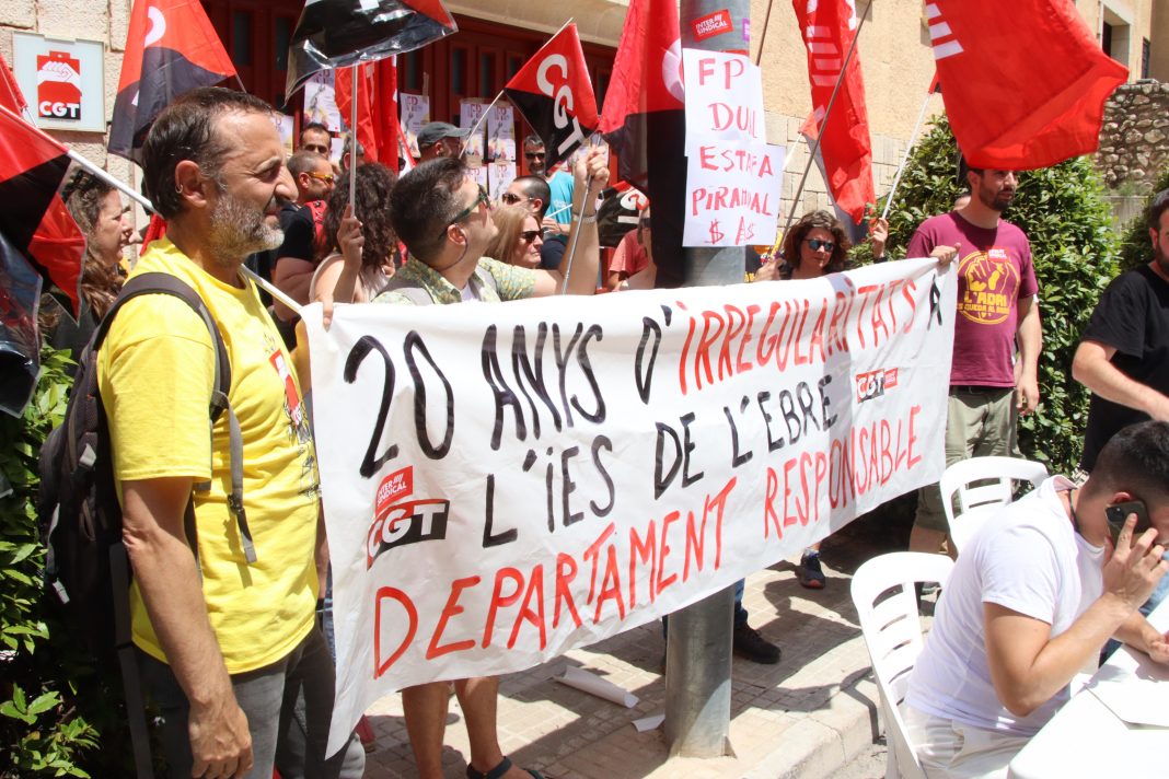 CGT i Intersindical han reclamat que els serveis territorials d’Educació i la inspecció educativa “assumeixin responsabilitats” per les irregularitats detectades a l’institut de l’Ebre sobre els contractes de pràctiques dels alumnes de Formació Professional. Educació ja va sancionar l’exdirector i l’exadministradora amb sis mesos sense sou ni feina però els sindicats han assegurat que hi havia “connivència” d’estaments superiors. Els representants dels treballadors s’han concentrat aquest dilluns davant la seu dels serveis territorials i han congregat una trentena de persones. També han demanat que s’aturi la implementació de l’FP Dual perquè consideren que està “fet a mida de la patronal” i no té en compte les necessitats dels estudiants.