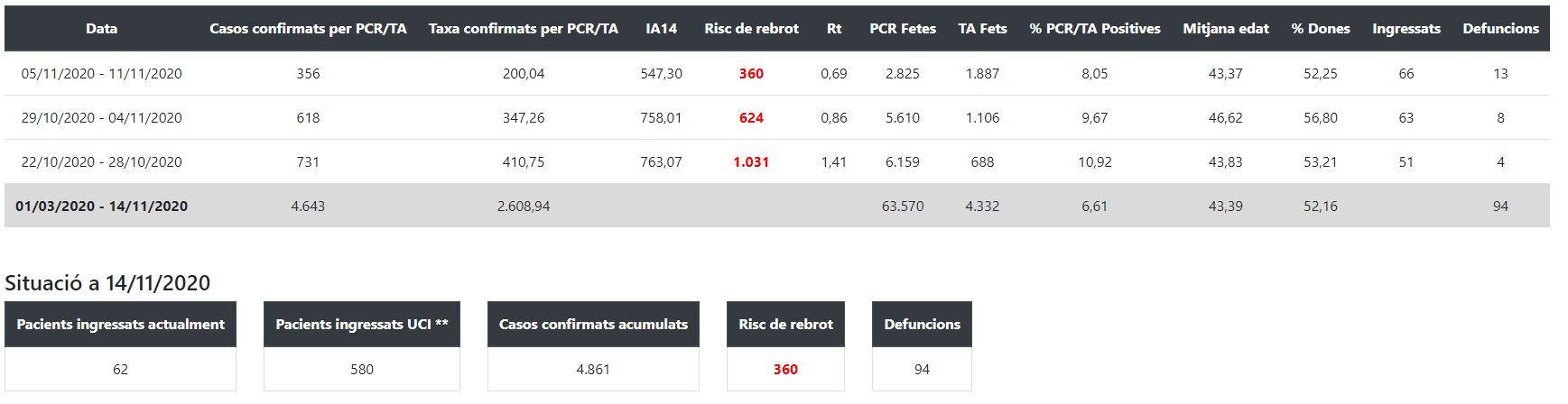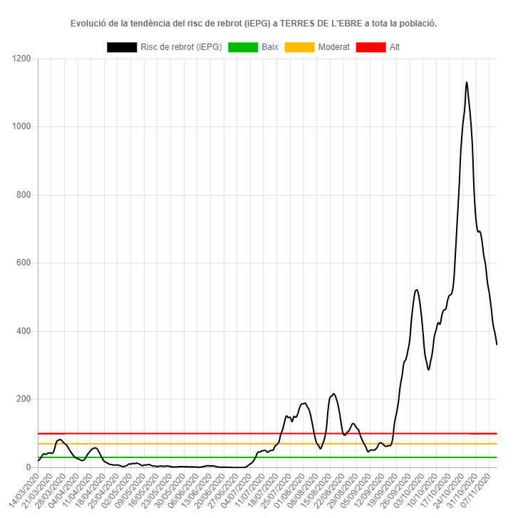 El risc de rebrot baixa 31 punts i se situa en 360 punts. La setmana anterior era de 624. La taxa de confirmats per PCR o tests d’antígens entre el 5 i l’11 de novembre és de 200,04 per cada 100.000 habitants. La incidència a 14 dies és de 547,30, pels 8758,01 de la setmana anterior.