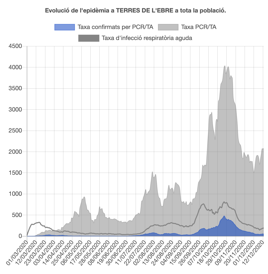 La regió sanitària de les Terres de l’Ebre acumula, des de l’inici de la pandèmia, 5.305 casos confirmats per PCR o antígens, 31 més que en el balanç anterior, i 5.544 si es tenen en compte la resta de proves. En aquesta regió han mort 122 persones, cap més respecte ahir. Entre el 7 i el 13 de desembre es va notificar dues defuncions i dos més en l’interval anterior.
