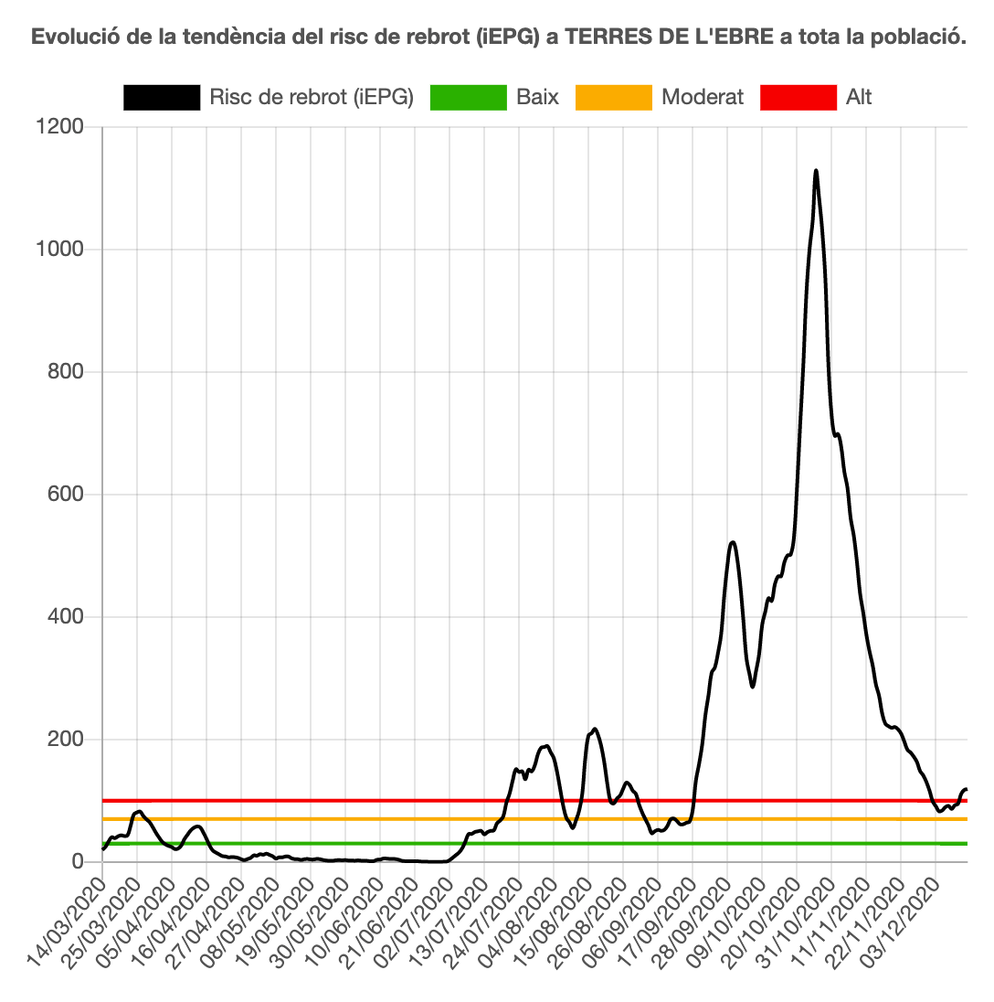 El risc de rebrot puja 2 punts i se situa en 119, per sobre del de la setmana anterior, quan era de 89. Per altra banda, la taxa de confirmats per PCR o test d’antígens entre el 7 i el 13 de desembre és de 51,13 per cada 100.000 habitants. La incidència a 14 dies és de 99,46, pels 129,80 de la setmana anterior. El 2,61% de les proves que es fan donen positiu.
