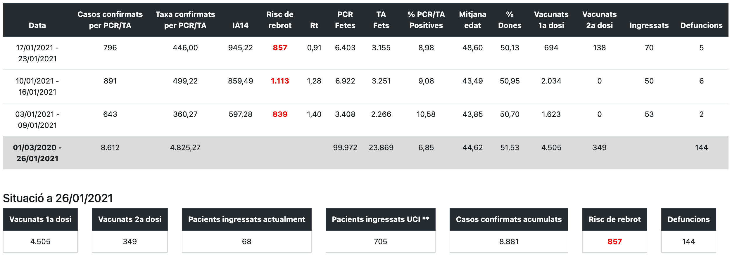 La taxa de confirmats per PCR o tests d’antígens entre el 17 i el 23 de gener és de 446 per cada 100.000 habitants. El 8,98% de les proves de la darrera setmana han donat positiu. D’altra banda, hi ha hagut dues noves morts i el total és de 144. Els vacunats de la primera dosi arriben a 4.505 i a 349 els vacunats de la segona dosi.