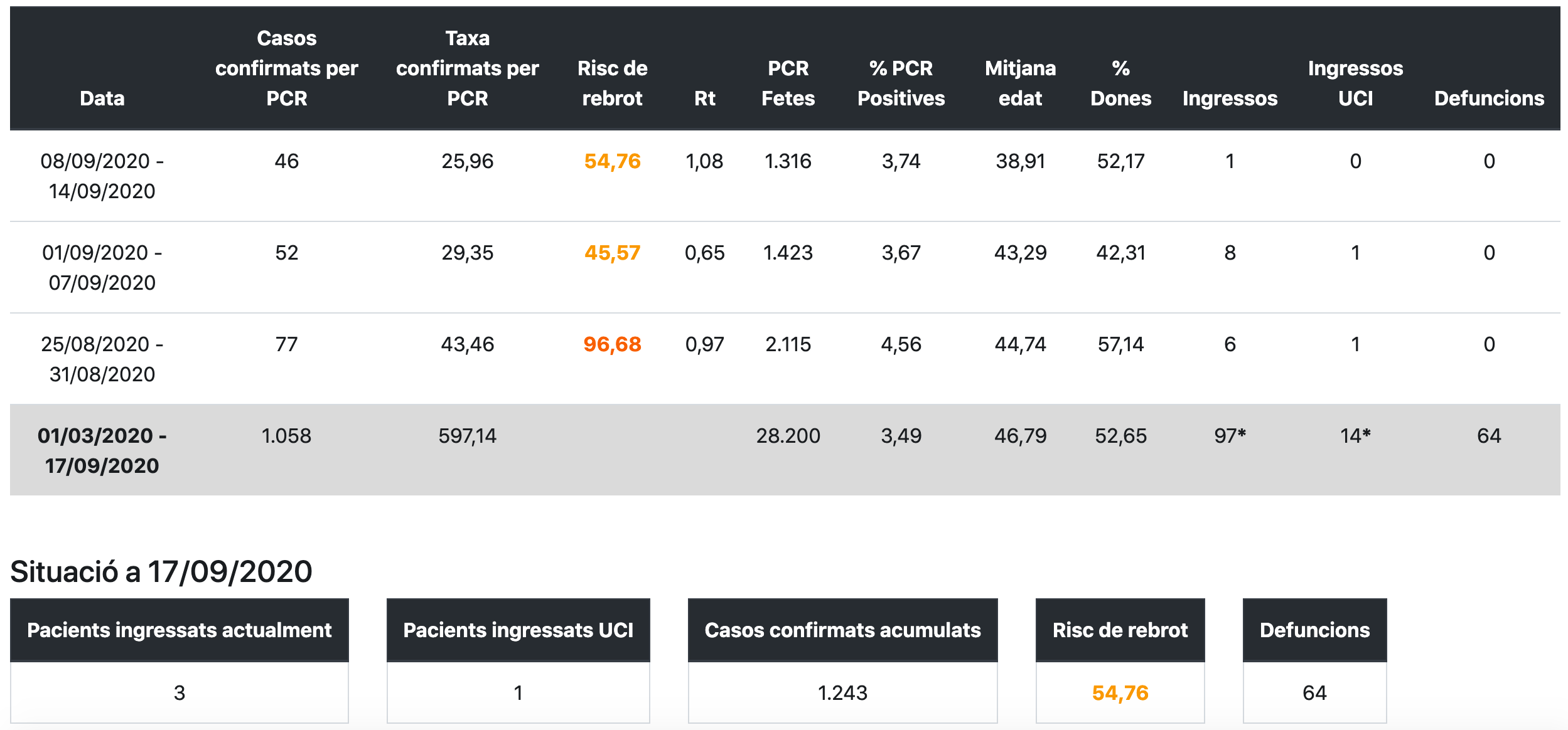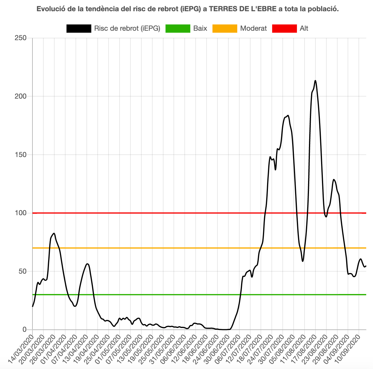 La regió de les Terres de l’Ebre acumula, des de l’inici de la pandèmia, 1.058 casos confirmats per PCR, 13 més que en el balanç anterior, i 1.243 si es tenen en compte la resta de proves. En aquesta regió han mort 64 persones, cap més respecte a l’últim balanç. El risc de rebrot disminueix lleugerament i se situa al 54,76, gairebé 2 punts menys respecte a les dades d’ahir. Per altra banda, la taxa de confirmats per PCR en els darrers set dies és de 25,96 per 100.000 habitants, mentre que l’Rt, és a dir, la velocitat de propagació del virus és d’1,08 i ha sofert una disminució de 0,8. Segons aquest últim balanç hi ha 3 pacients ingressats als hospitals, dos menys que ahir, un dels quals a l’UCI.