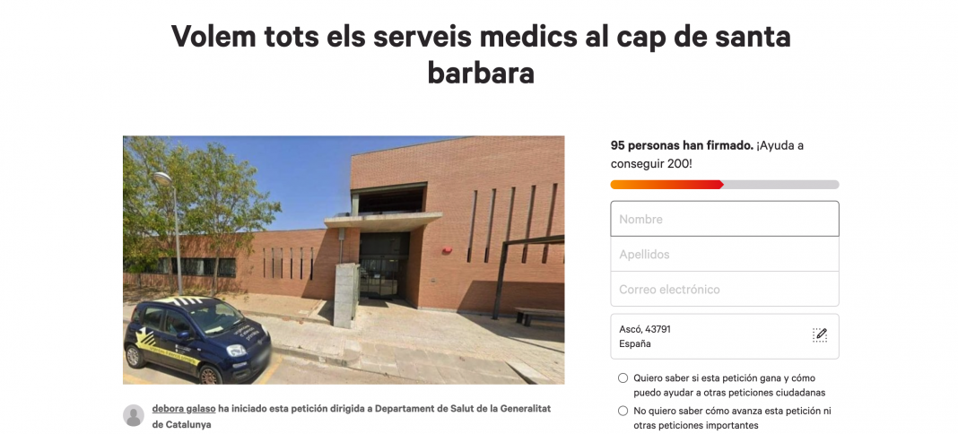 Per sumar-se a aquesta petició només cal signar a la plataforma Change.org “volem tots els serveis mèdics al CAP de Santa Bàrbara”.