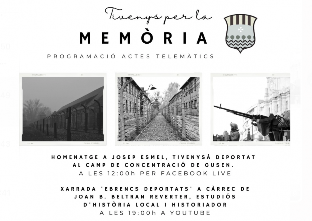 Aquest dissabte, dia 30 de gener, Tivenys commemora el Dia Internacional en Memòria de les Víctimes de l’Holocaust. La jornada estarà dividida en dos actes que es podran seguir de manera telemàtica per les xarxes socials de l’ajuntament. A les 12 del migdia es durà a terme un reconeixement institucional al fill de Tivenys, Josep Esmel, deportat al camp de concentració de GUSEN i mort al mateix lloc. L’acte es podrà seguir en directe per la pàgina de Facebook de l’ajuntament.