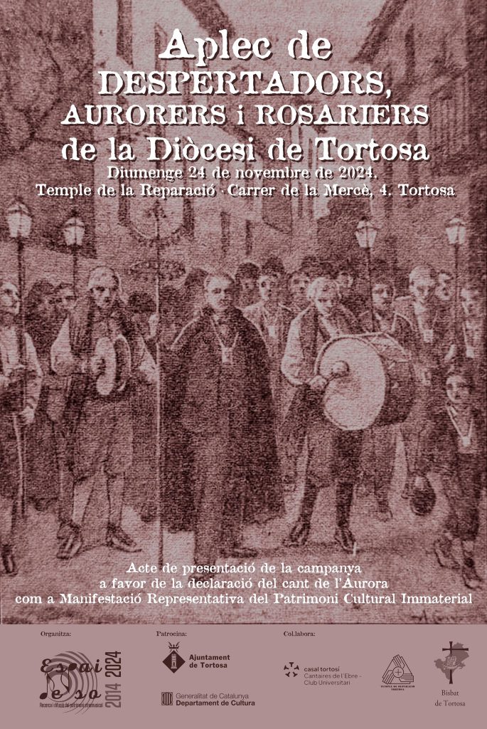L’Espai de So, entitat de recerca i difusió etnogràfica, ha organitzat el primer Aplec de “despertadors, aurorers i rosariers” de la Diòcesi de Tortosa. La capital ebrenca acollirà aquest diumenge més d’una seixantena de persones, que interpretaran els càntics d’aquesta tradició, al Temple de la Reparació. S’esperen grups i cantadors de Marçà (Priorat), la Fatarella, la Pobla de Massaluca i Vilalba dels Arcs (Terra Alta), Alcanar (Montsià) i Benicarló (Baix Maestrat). Actualment, es fa una campanya de reconeixement estatal perquè el Cant religiós del Desperta de l’Aurora sigui declarat Manifestació del Patrimoni Cultural Immaterial d’Espanya, pas previ per rebre també el reconeixement com a patrimoni immaterial per la UNESCO.