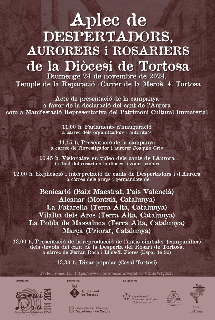 Durant l’Aplec de diumenge, es projectarà un reportatge sobre els cants de Desperta de l’Aurora a la Diòcesi de Tortosa i el Matarranya. La jornada clourà amb la presentació de l’antic “cimbaler o campaniller” de la Desperta de l’Aurora de la Mare de Déu de Cinta de Tortosa, que ha estat reproduït per Ferran Roca, membre d’Espai de So.