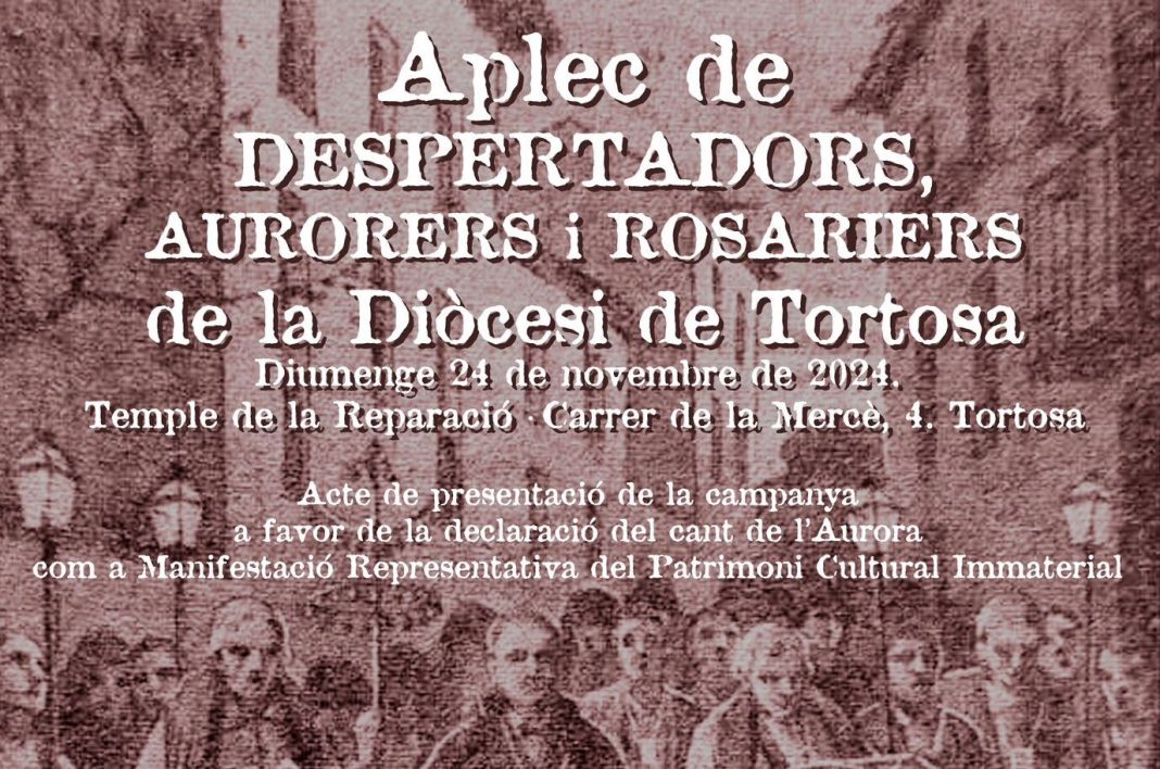 L’Espai de So, entitat de recerca i difusió etnogràfica, ha organitzat el primer Aplec de “despertadors, aurorers i rosariers” de la Diòcesi de Tortosa. La capital ebrenca acollirà aquest diumenge més d’una seixantena de persones, que interpretaran els càntics d’aquesta tradició, al Temple de la Reparació. S’esperen grups i cantadors de Marçà (Priorat), la Fatarella, la Pobla de Massaluca i Vilalba dels Arcs (Terra Alta), Alcanar (Montsià) i Benicarló (Baix Maestrat). Actualment, es fa una campanya de reconeixement estatal perquè el Cant religiós del Desperta de l’Aurora sigui declarat Manifestació del Patrimoni Cultural Immaterial d’Espanya, pas previ per rebre també el reconeixement com a patrimoni immaterial per la UNESCO.