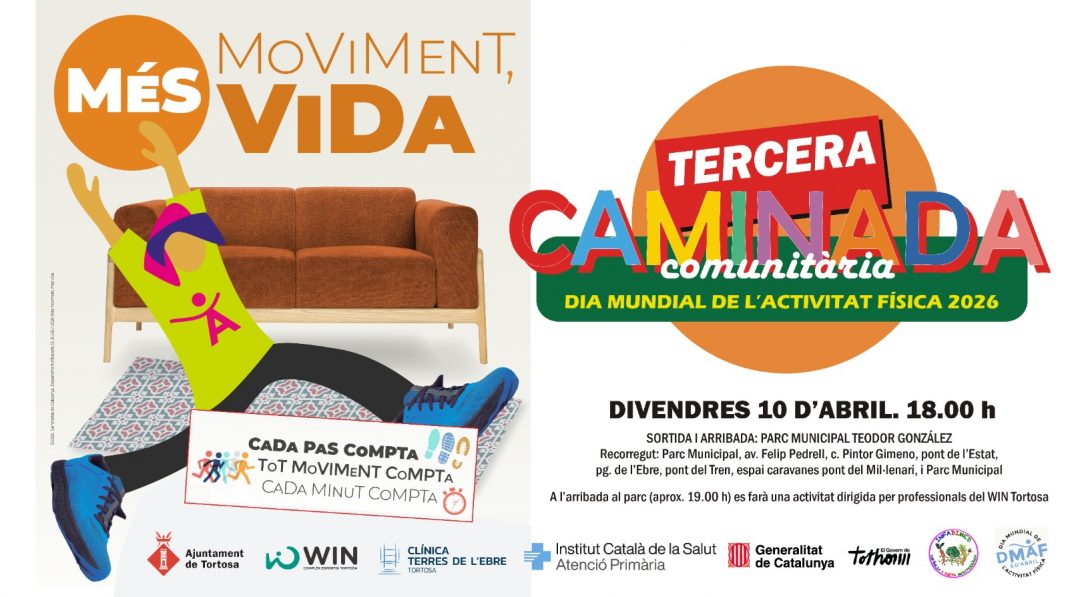 Tortosa se suma un any més al Dia Mundial de l’Activitat Física amb l’organització de la tercera edició de la Caminada Comunitària, que tindrà lloc divendres 10 d’abril a partir de les 18.00 hores. La iniciativa forma part de la campanya impulsada pel Departament d’Esports de la Generalitat i l’Agència de Salut Pública de Catalunya, que enguany porta el lema ‘Més moviment, més vida‘. L’objectiu és promoure l’activitat física i reduir el sedentarisme com a elements clau per a la salut i el benestar.