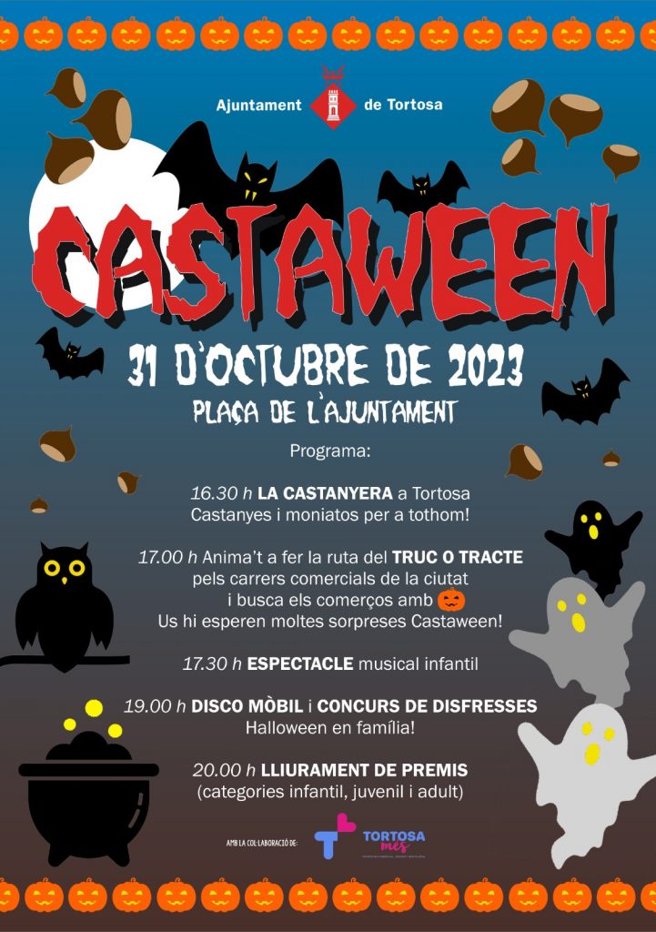 “Castaween combina tradició amb modernitat i a Tortosa organitzem aquesta celebració de la mà d’entitats del municipi amb l’objectiu de fer sortir la gent al carrer i dinamitzar la ciutat”, ha dit Grau. Els actes començaran a les 16.30 a la plaça de l’Ajuntament, on hi haurà parades amb castanyeres que repartiran castanyes i moniatos i a partir de les 17.00 hores s’iniciarà la ruta del Truc o Tracte pels carrers comercials, amb la participació de més d’un centenar d’establiments, que tindran un globus a l’aparador i una carabassa que serà l’indicatiu que el comerç participa en la campanya. A les 17.30 hi haurà un espectacle infantil i després sessió de disco mòbil i concurs de disfresses. Es lliuraran premis, prèvia inscripció, en tres categories (infantil, juvenil i adult).