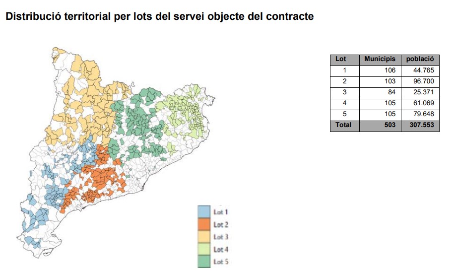Per tal de guanyar eficàcia, poder optimitzar el temps i que el servei sigui ambientalment sostenible, evitant desplaçaments de llarg recorregut entre els municipis inclosos en el servei, la licitació s’ha dividit en els 5 lots següents: