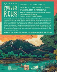 En aquest context, s’han organitzat dues jornades de guiatge a l’exposició combinades amb tallers d’arqueologia experimental. La primera tindrà lloc aquest dissabte 17 de gener a les 10 h i estarà dedicada a la metal·lúrgia, a càrrec de Marco Pla. Durant la sessió es mostrarà tot el procés d’elaboració d’un forn de foneria de metalls, la fosa del plom i l’obtenció de plaques sobre les quals els participants podran gravar inscripcions amb escriptura ibèrica, utilitzant tècniques i eines semblants a les de l’època.