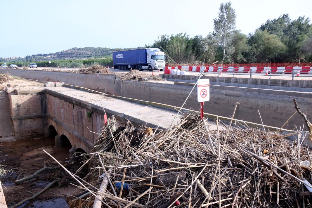 La circulació per l’Eix de l’Ebre (C-12) entre Amposta i Tortosa va quedar tallada en aquest punt més de dos dies. Segons Trànsit, restaurar la carretera a l’estat anterior pot trigar encara algunes setmanes: en aquests moments, hi ha només un carril obert i es dona pas alternatiu amb semàfors en horari feiner. Les màquines segueixen treballant per reparar les estructures danyades i retirar les restes dels elements de seguretat viària malmesos, però sobretot les quantitats ingents de residus vegetals i de plàstics que s’hi acumulen.