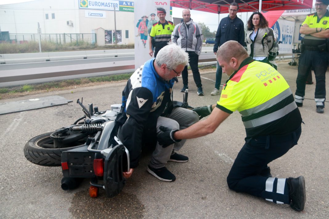 Aixecar una motocicleta de terra després d’un accident, fer un revolt amb seguretat o col·locar-se correctament damunt del vehicle són algunes de les accions que s’han posat en pràctica en el marc de la jornada de mobilitat segura a Roquetes. Diversos agents dels Mossos d’Esquadra han acompanyat els motoristes a l’hora de fer aquests exercicis, amb l’objectiu d’oferir una formació pràctica perquè sàpiguen com actuar en cas d’un incident.