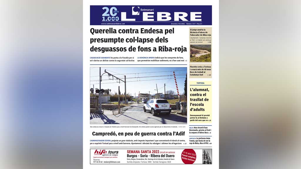 La portada en paper de l’edició número 1017 del Setmanari L’EBRE dedica el titular principal a la primera denúncia per la via penal contra els gestors dels embassaments del tram final de l’Ebre, en este cas Endesa, per la suposada falta de funcionalitat dels desguassos de fons del pantà de Riba-roja. L’Associació Sediments, que reclama que estos desguassos permeten mobilitzar fangs per a lluitar contra la regressió del Delta, veu en la seua indisponibilitat un possible delicte contra la seguretat col·lectiva, ja que una avinguda excepcional d’aigua, que superés la presa per dalt, provocaria un risc de trencament i podria afectar de forma catastròfica els pobles que hi ha riu avall.