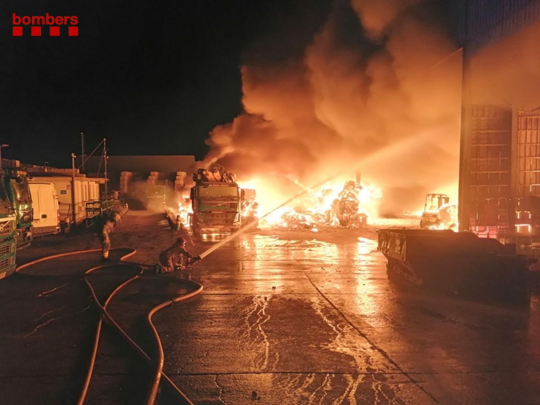 Cremen camions i maquinària dins una nau industrial dedicada al reciclatge, a Amposta (avís 21.16h) Es treballa per contenir les flames i que no afectin les naus adjacents. Hi som amb 9 dotacions #bomberscat pic.twitter.com/VjChE5meOo