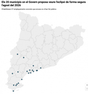 El Govern ha proposat 27 emplaçaments perquè la població pugui veure l’eclipsi solar del 12 d’agost de l’any vinent de forma segura i, alhora, amb les millors condicions de visibilitat. Els punts estan repartits en 20 municipis del Camp de Tarragona, Terres de l’Ebre i Ponent, i tindran en conjunt una capacitat per a 85.200 persones i uns 40.000 vehicles. La Generalitat preveu activar un dispositiu en el marc del pla territorial de protecció civil Procicat per fer seguiment de l’esdeveniment des del punt de vista de la seguretat, la mobilitat o riscos com el d’incendi. També treballa amb els municipis en les activitats de divulgació i prepara una campanya per a evitar danys a la vista i conscienciar de la necessitat d’usar protecció visual.